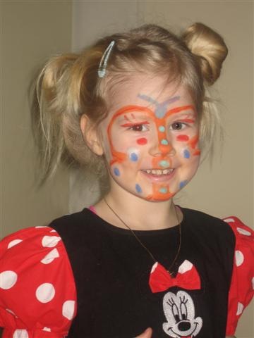 Músin fékk að snyrta mömmu sína um síðustu helgi. Tókst það svona líka glimmrandi vel. Síðan fékk ég að snyrta hana. Henni fannst ég nú hálf léleg að geta ekki gert svona putta mállingu eins og hún gerði svo vel. Ég skildi nú ekki alveg fyrst hvað hún var að meina en að sjálfsögðu er það munstrið sem hún bjó til á augnlokin. Þegar vel er að gáð líta þau ut eins og fingravetlingar :)
