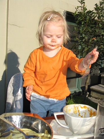 Emma aðeins að smakka á gulrótarsúpunni hennar mömmu.